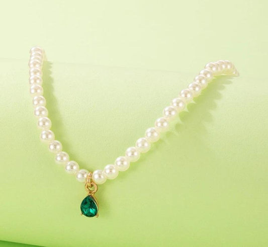 Pearl Necklace Green Rhinestone Pendant
