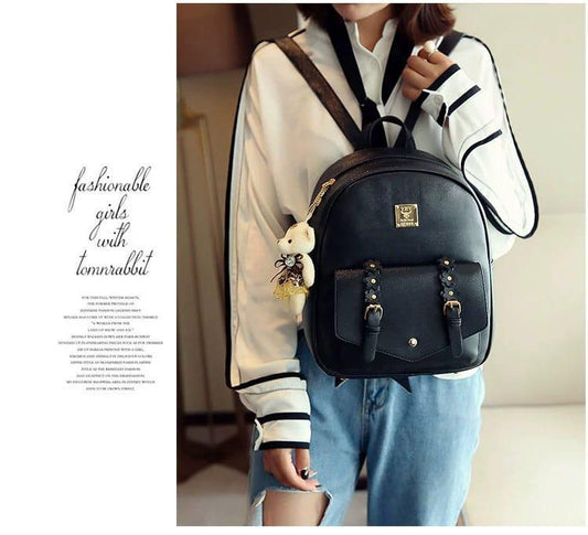 Women's Leather Backpack with Teddy Bear Charm