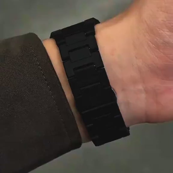 The strap is made from carbon fiber composite material, which offers an exceptional combination of properties. Carbon fiber is: Incredibly Strong – stronger than steel by weight, making it highly resistant to breaking or deforming. Lightweight – significantly lighter than metal bracelets, reducing wrist fatigue during extended wear. Scratch-Resistant – the hard surface resists scratches and scuffs that would mar traditional materials. Hypoallergenic – won't cause skin irritation or allergic reactions like some metals can. Modern Aesthetic – the distinctive woven texture and matte finish create a high-tech, contemporary look. The strap is constructed with interlocking links that provide flexibility and comfort while maintaining structural integrity. This design allows the strap to conform to your wrist shape while distributing weight evenly for all-day comfort. 💎