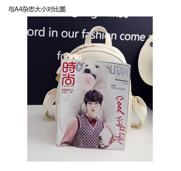 A fluffy teddy bear keychain dangles from the top zipper, adding an adorable, playful touch that personalizes your backpack and makes it instantly recognizable. The bear wears a cute outfit and accessories, creating a charming focal point that appeals to students, young professionals, and anyone who loves cute fashion details. The keychain is removable if you prefer a more minimalist look.